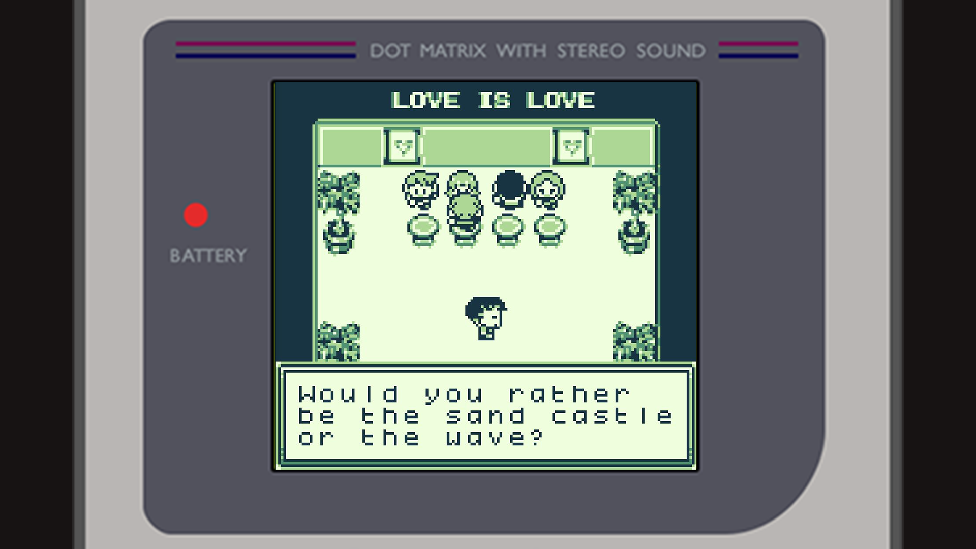 Created in GB Studio. Existential Speed Dating is a GB multiplayer speed dating sim where you and 4